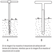 - Extrayendo la muestra con sonda o barrena. Es un instrumento hueco que se clava en el terreno y, al extraerlo, se obtiene la muestra. Es el método más extendido por la rapidez y el precio, más barato.